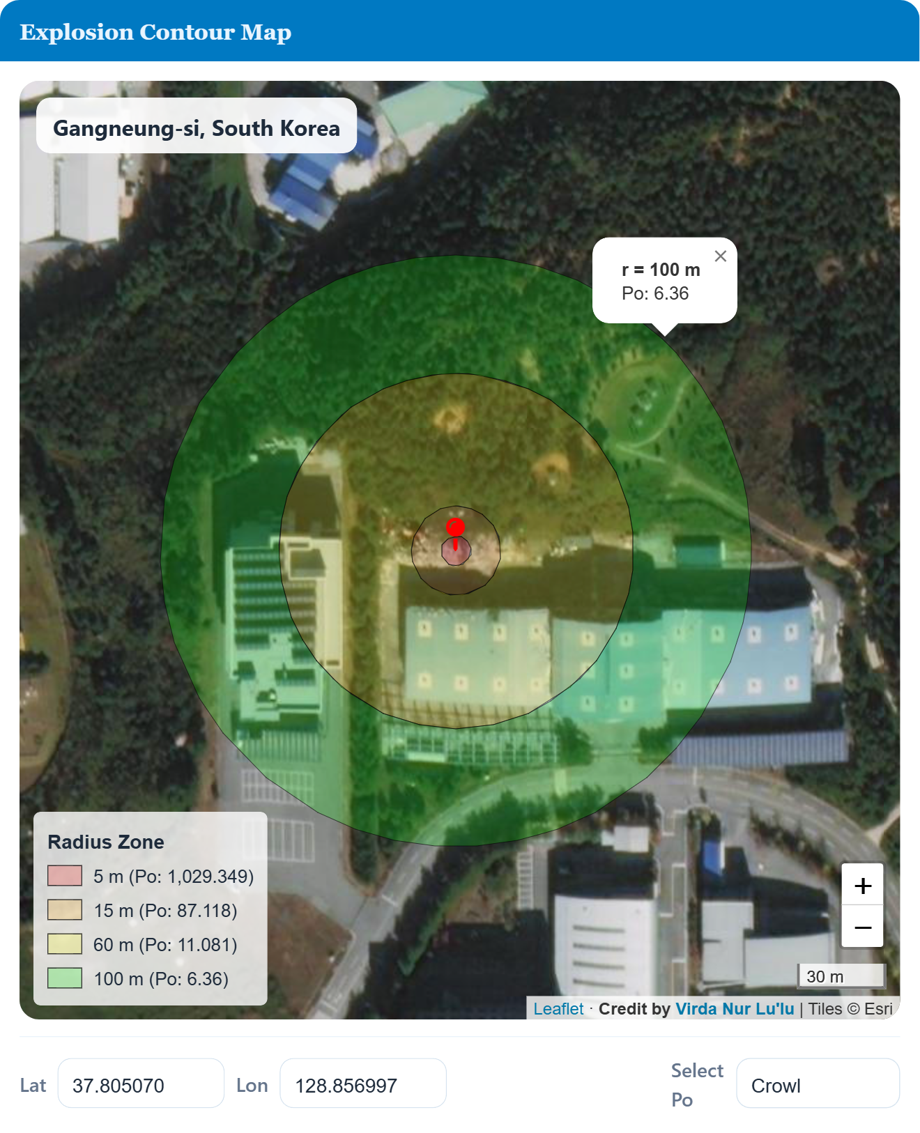 - Gangneung case (WTNT ≈ 50 kg): Po ≈ 20.2–32.6 kPa at 15 m and Po ≈ 1.95–3.59 kPa at 100 m.