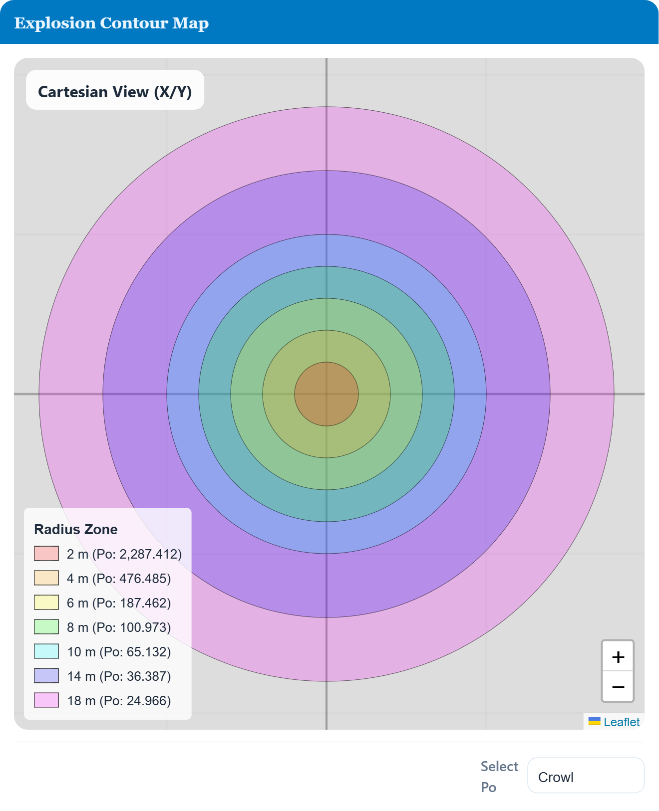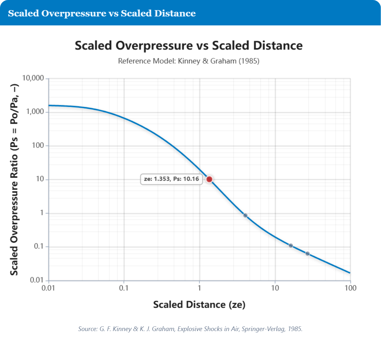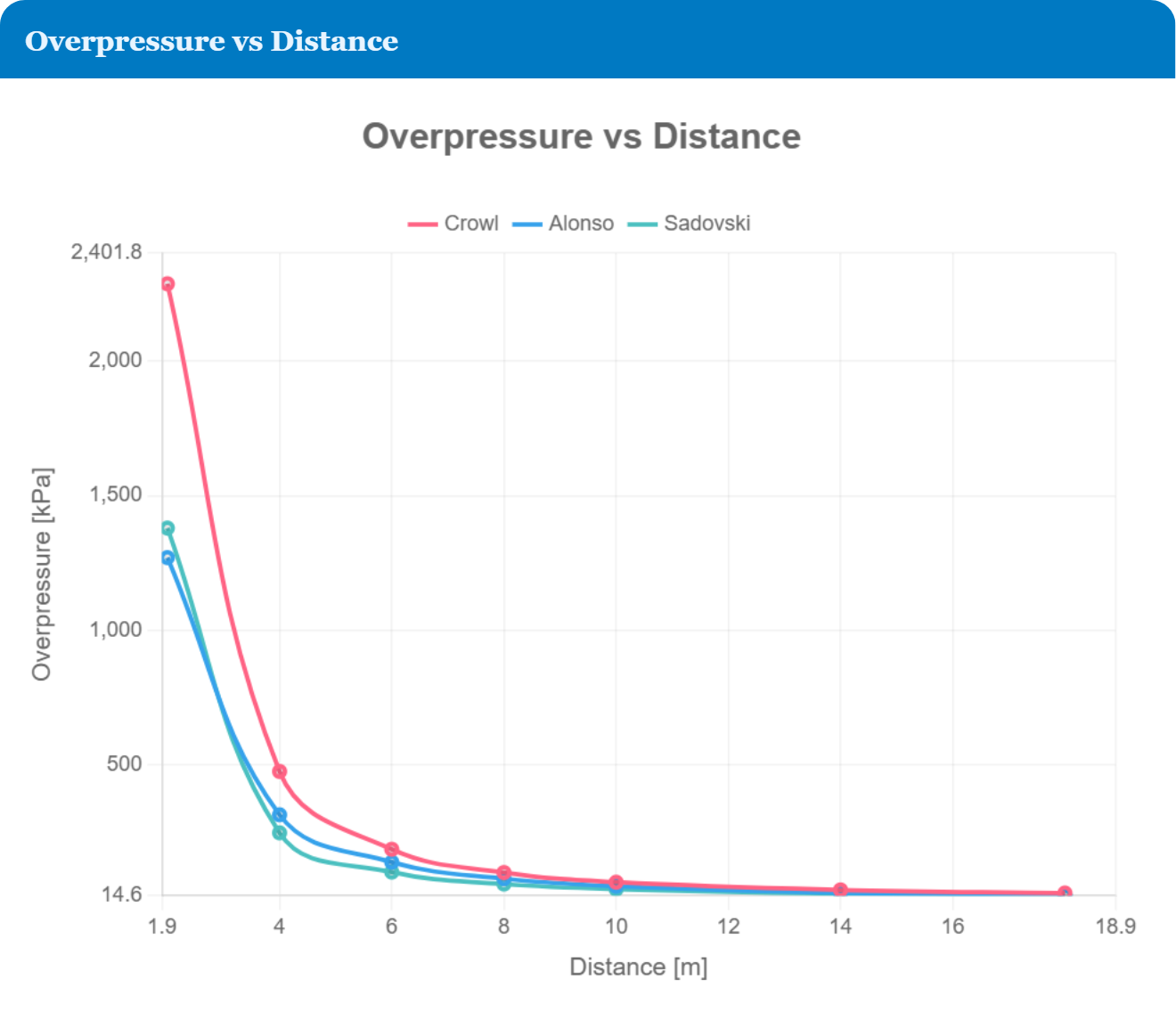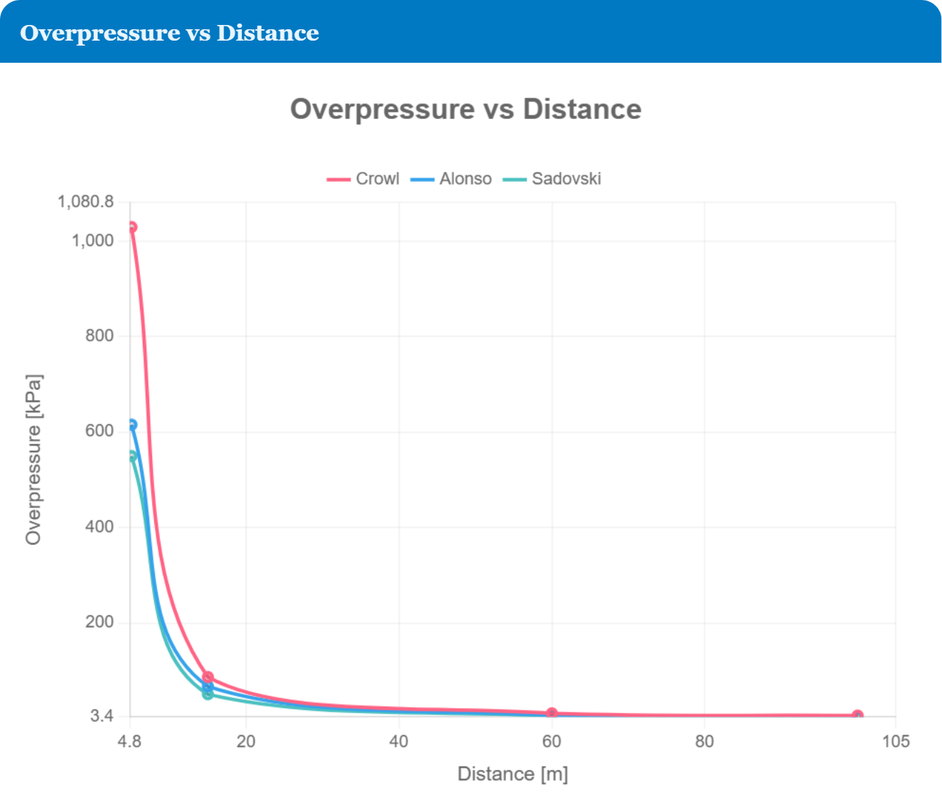 - Predict peak side-on overpressure (Po) using Crowl, Alonso, and Sadovski correlations, with extrapolation flagged beyond validity ranges.